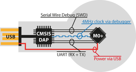 Microcontroller: Spansion S6E1A12B0AGP2 ARM Cortex M0+ 88KByte Flash 6KByte SRAM 1x Multicon (I2C, SPI or UART) USB to UART converter USB debugger (CMSIS-DAP) 25 pins usable 2 user LEDs available