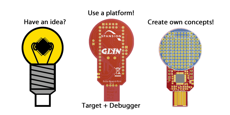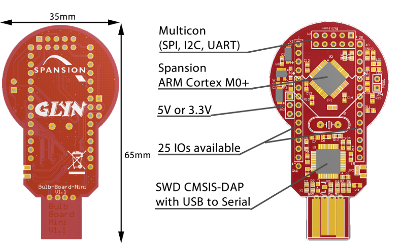 The Bulb Board was designed for the Spansion Flexible Microcontrollers (FM Series) based on ARM Cortex M core. The Bulb Board Mini uses an ARM Cortex M0+ MCU.Features