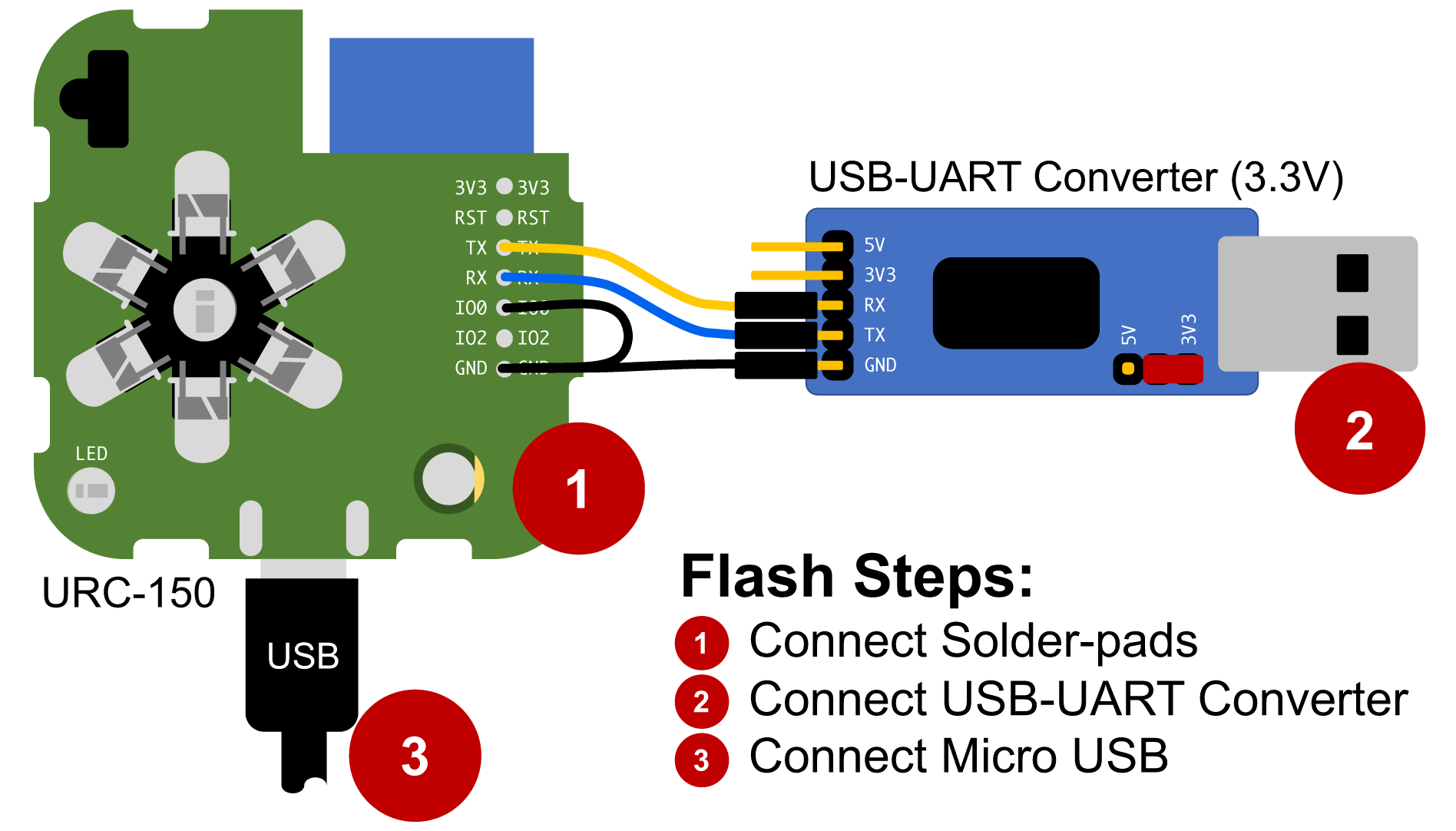 Bilder:Verbinden der Lötpads auf der Oberseite der URC-150 Platine und Anschluss an einen USB zu Seriell Wandler (3.3V) Zuerst den USB zu Seriell Wandler mit Strom versorgen Dann den URC-150 mit Strom versorgen ![]()
