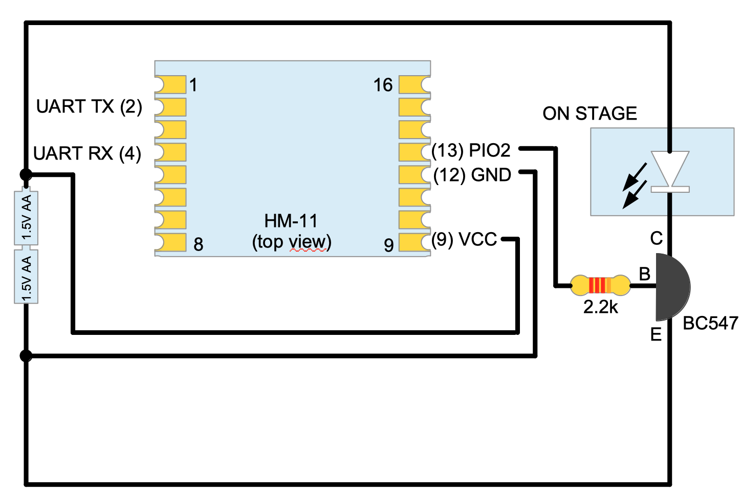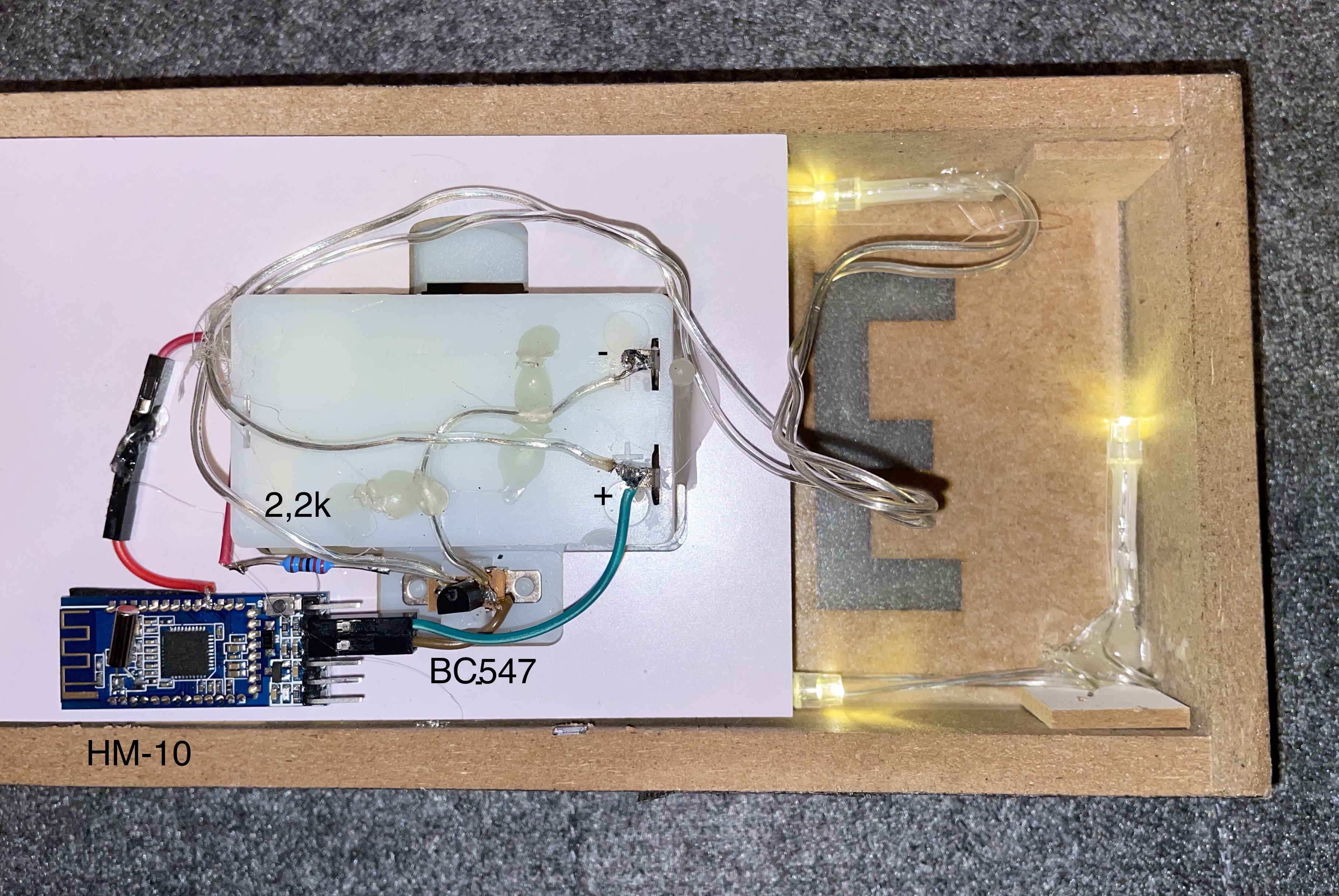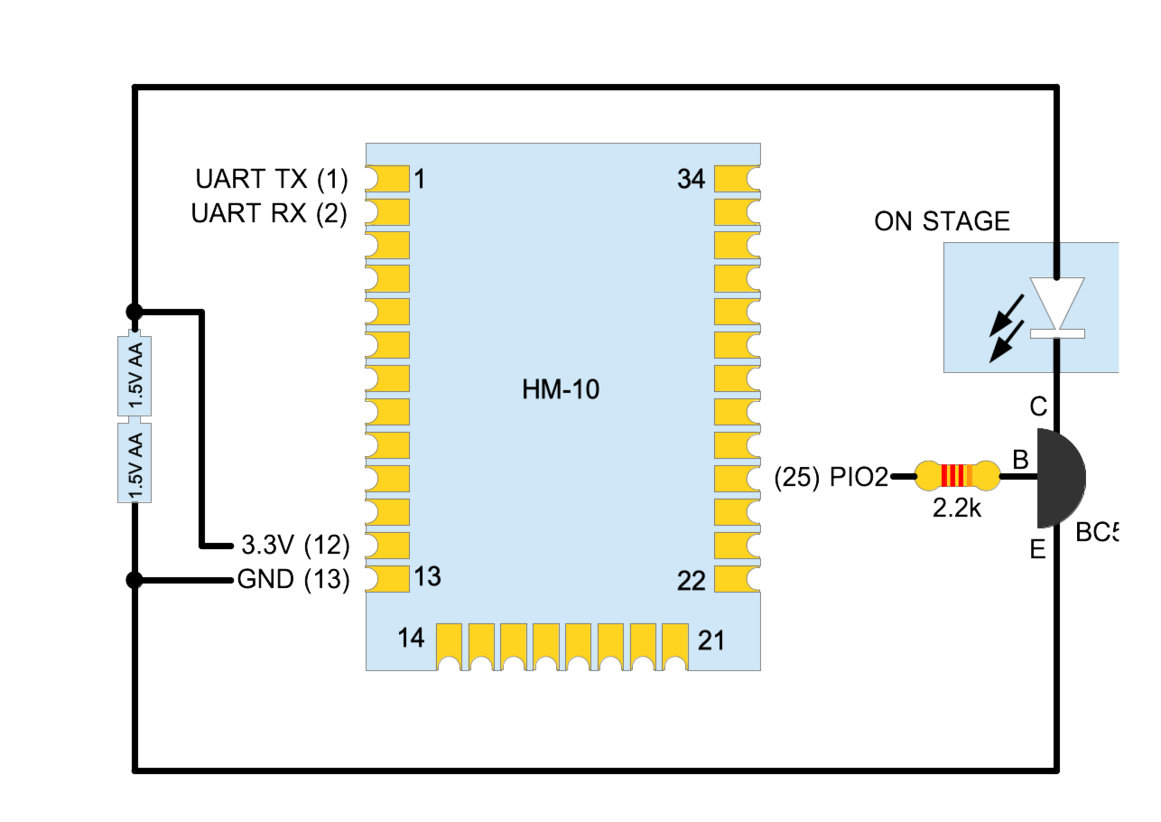 The base is an "ON STAGE" LED sign powered by 2x AA 1.5V batteries. The connection of the LED sign has to be changed, so it matches to the following schematic by adding a HM-10 BLE module: